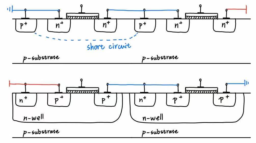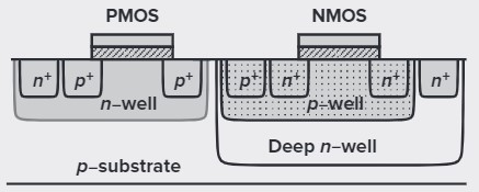 In CMOS technologies, NMOS and PMOS devices must be fabricated on the same wafer (usually p-type substrate), therefore PMOS device is fabricated in an n-well [Fig. 2.4(b)]. In most circuits, the n-well is tied to the most positive supply voltage.