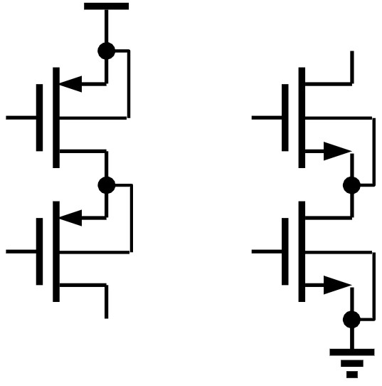 - NMOS:$I_D = \frac{1}{2} \mu_n C_\tx{ox} \frac{W}{L'}(V_{GS}-V_\tx{TH})^2$