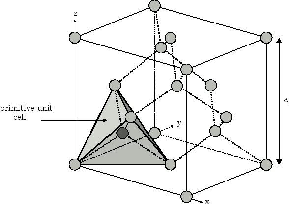 硅的结构是 diamond structure,准确来讲是 FCC(Face Center Cubic),由于它有 4 个 valence electrons,与周围 4 个硅形成 4 个 covalent band,所以它的 primitive cell 的结构如下: